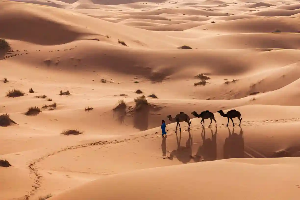 After breakfast, continue south to the last village before the Sahara, Mhamid. From here, the road disappears, and a 4×4 takes you off-road across rocky desert and sandy plains into the dunes of Erg Chigaga, one of the most remote areas of the Moroccan Sahara. Upon arrival, take a camel ride into the dunes at sunset. Dinner, traditional music, and overnight in a desert camp under the stars.